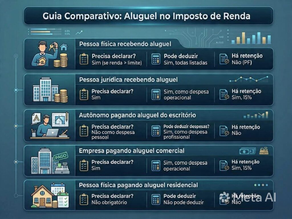 Exceção importante: Se você é autônomo, contribuinte individual ou proprietário de empresa, pode deduzir aluguel como despesa operacional no seu negócio (Imposto de Renda Pessoa Jurídica ou como despesa profissional).