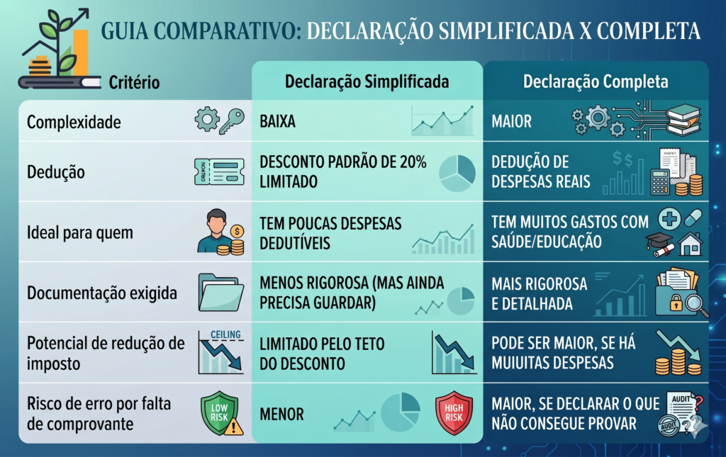 | Potencial de redução de imposto | Limitado pelo teto do desconto | Pode ser maior, se há muitas despesas |